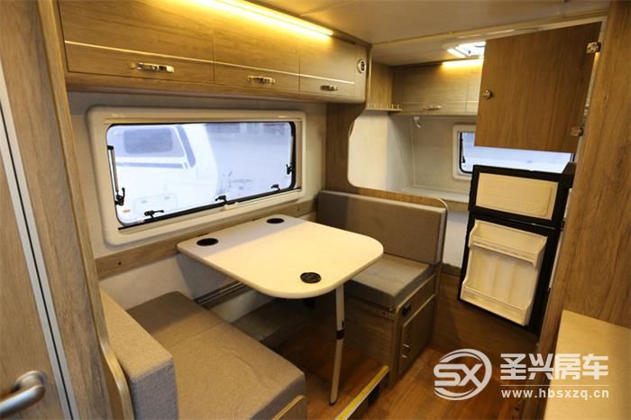 五人版布局箱體前部休息區可作為兩張單人床使用,也可以拼接為2*2米的大床,能睡下三口人。會客區卡座沙發可拼接為2*1.2米雙人床。整體可供五人休息。