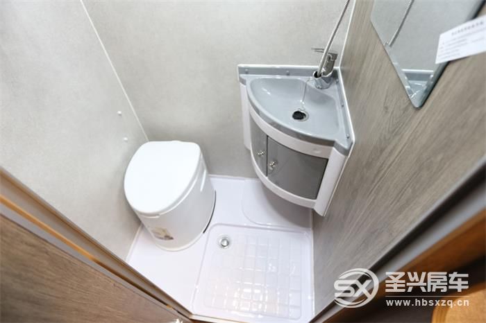 盥洗室為一體成型設計,為了節約空間方便乘客更好的使用淋浴,采用了便攜式馬桶,同時配有玻璃鋼洗手池、抽拉一體式淋浴花灑、浴室鏡、毛巾桿、浴簾、雙向排風扇。在洗手池的下方還配有雙開門的儲物柜,可以用來存放洗漱用品。
